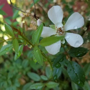 Peeking out from the summer foliage, a single flower blooms on Nozomi, a delicate miniature rose that is a long-time favorite that I’ve had since… 1993? This year she’s only bloomed this once; she is usually among the most prolific bloomers among my roses. I make a mental note to re-pot her this winter.