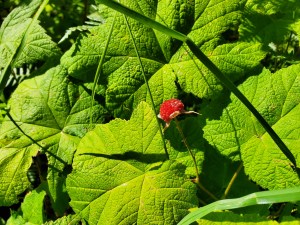I spot a thicket of ripening thimbleberries along my path. I help myself to just one; they are too fragile for commercial cultivation, and have minimal fruit. The lovely flavor is unique, and I savor it, present, just being for that long sweet moment. I enjoy just the one berry, leaving the rest for the birds, before walking on.