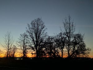 The gate into the main parking area opens with a screech. I move the car closer to the access point for the year-round trail. I add my scarf, hat, and oversized fleece to my layers and put my gloves and cane handily within reach. I won’t want to stop long this morning, so I finish this now, before I set off down the trail. The colorful sunrise is a beautiful backdrop to the oaks.