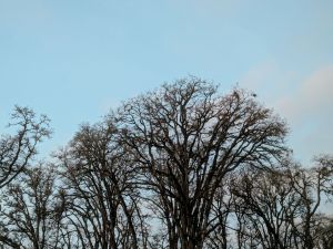 I sit staring into the tree tops, enjoying the moment. I sigh to myself and wonder what’s next? The view reminds me of an old oil painting, scattered clouds of not quite uniform shape and size, subtle hues of pastel pink and pale blue. The trees along the edge of the creek beyond the vineyard stand out against the pale blue sky, an indistinct smudge of darkest green slowly being swallowed up in morning mist. The sky to the south is infused with pink and streaked with lavender clouds. The sunrise is orange. Pretty. A good day to fill the gas tank and drive to the horizon. Well, it’s a nice idea, but it’s also a work day. 😆