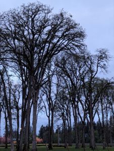 Down the trail, past blooming cherry trees, and tall oaks. Past vineyards with tall green grass growing between the rows. Along the creek and the strip of forest growing along the bank, I walk listening to the loud calls of the robins and softer calls of a variety of small brown birds. Eventually, I reach my halfway point and stop for a moment. Mostly awake by this point, I sit and write, meditate, and reflect. New day, new challenges…