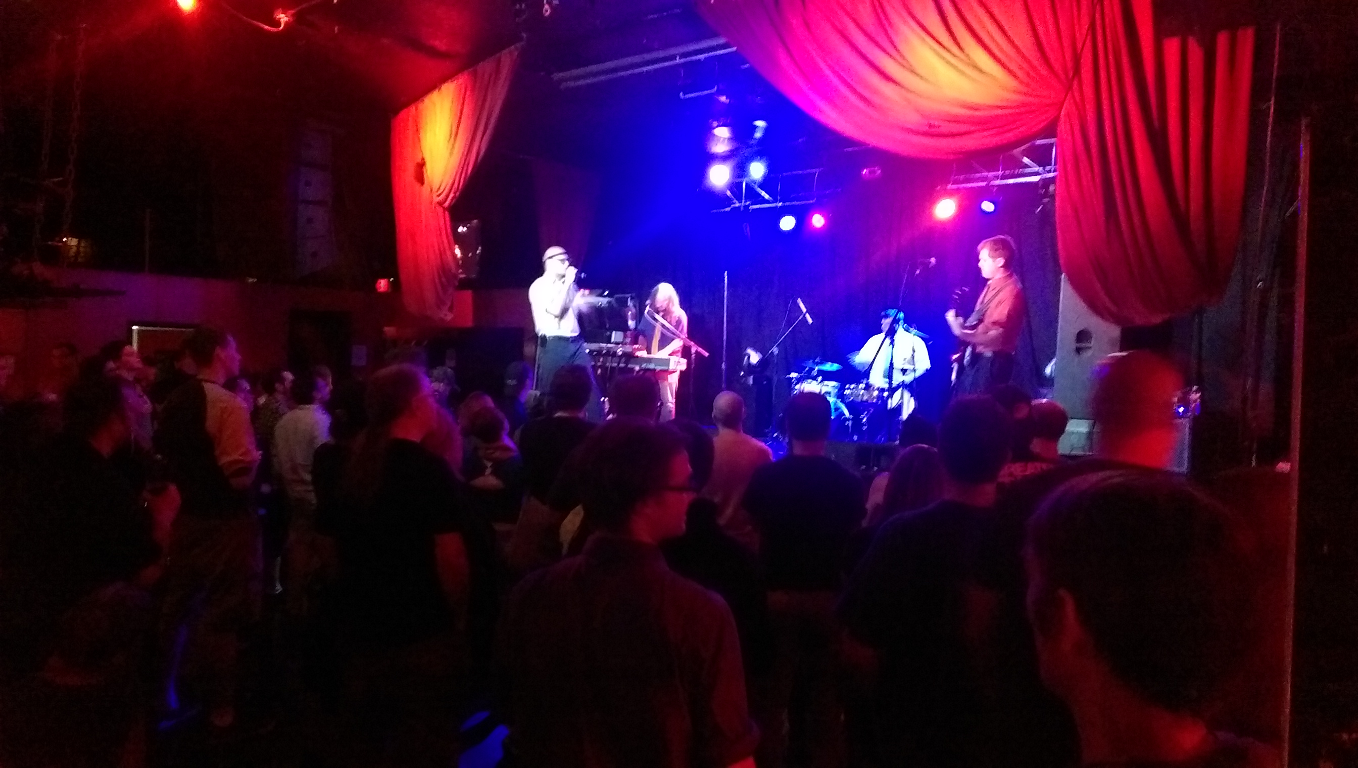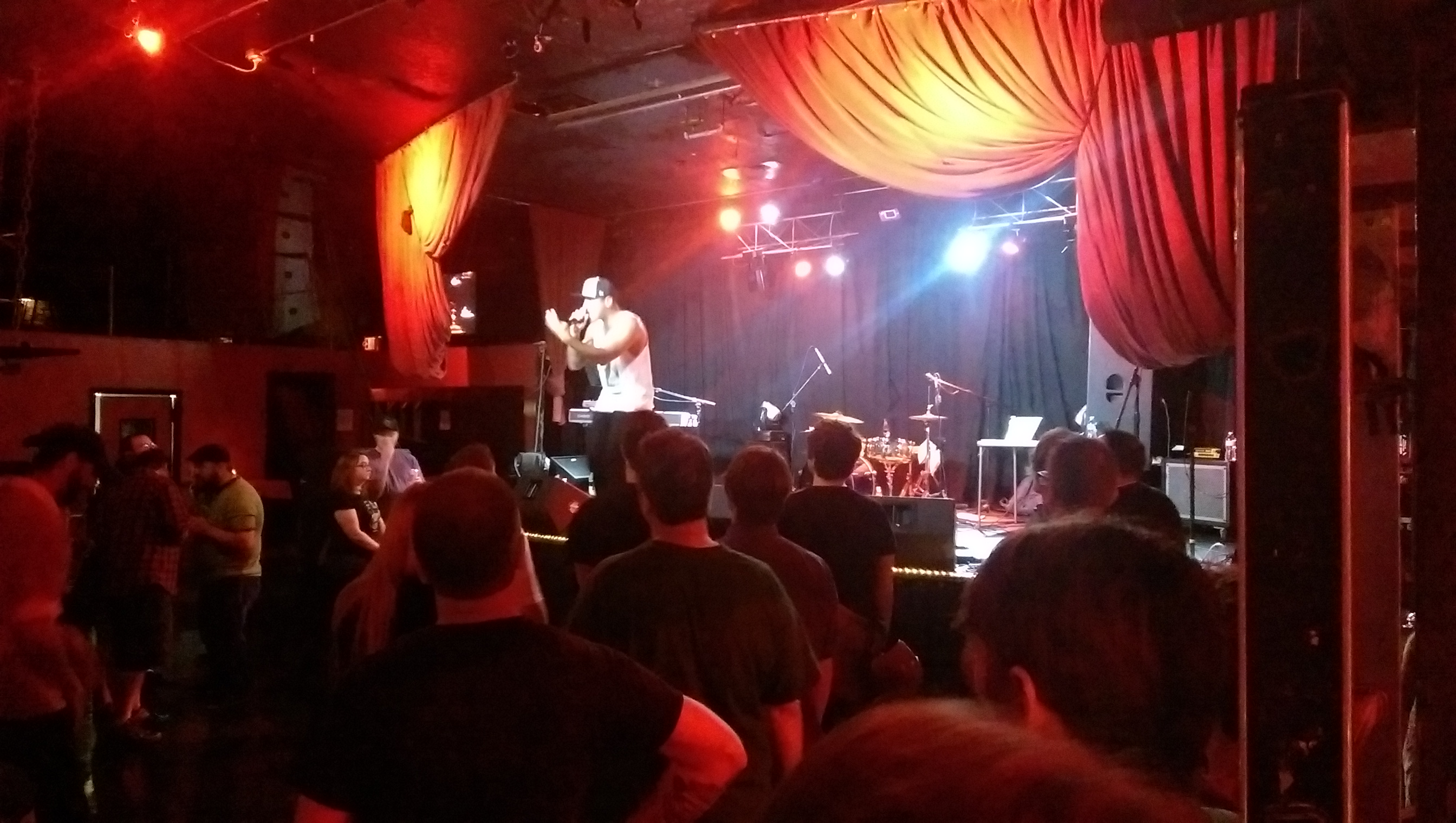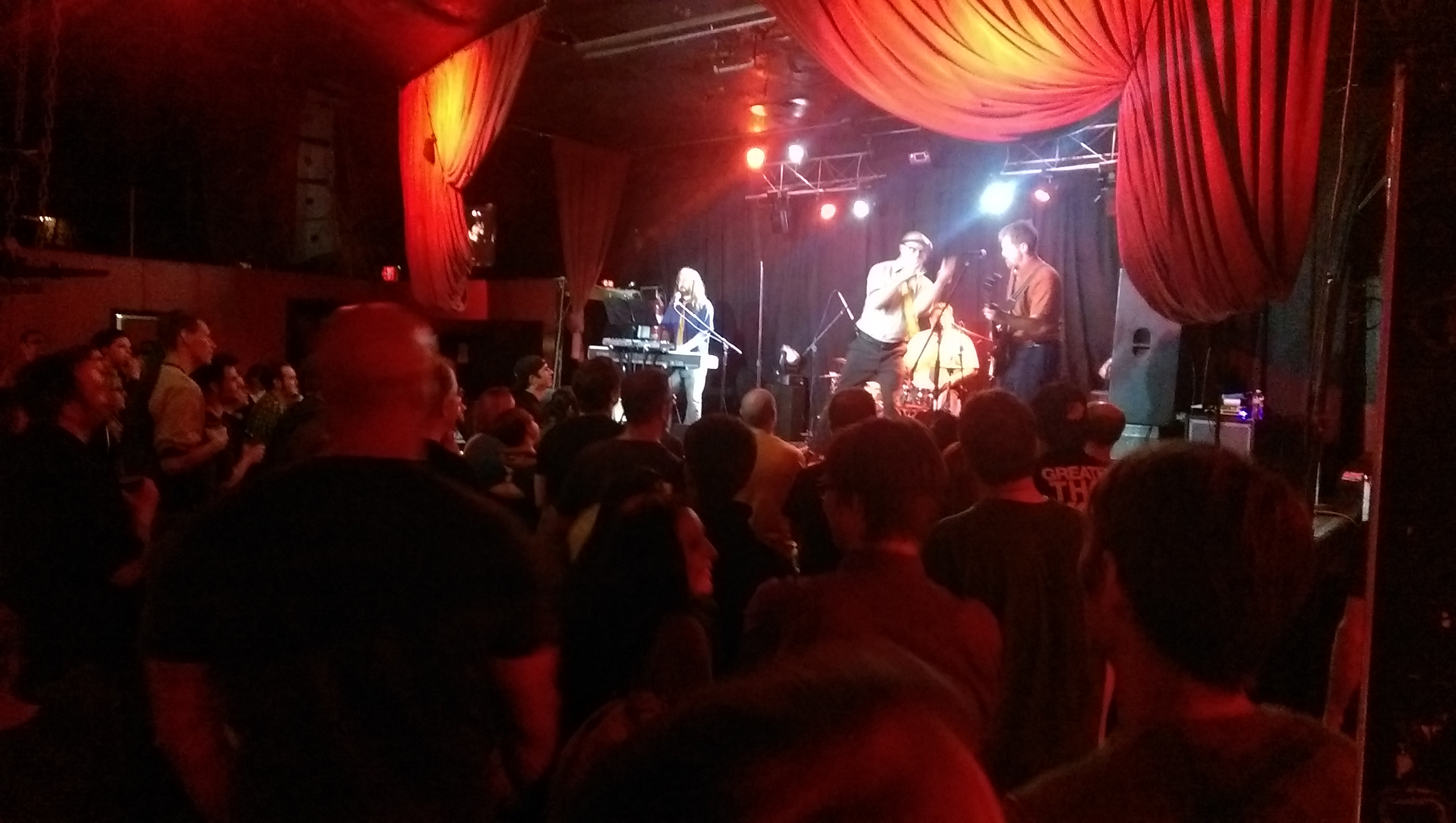 I hung with my temporary bestie, Eli (short for Elizabeth), and shortly into the evening, and before the show started, we were joined at the bar by Joey-a-Software-Guy. Both very cool people. We had a blast. Eli and I connected when she arrived and immediately had to shake off the possible creeper I’d taken a seat at the bar to move farther away from. It’s a common experience for women, and she and I laughed it off, shared ‘war stories of similar/different/this one time’ and took turns keeping an eye on each other’s stuff for trips to the restroom, or the merchandise table. Last night I very much valued the community of women. Joey and Eli found some nice moments to connect, and at one point I found myself giggling over how ‘typical’ in life’s plot writing it would be for Eli and Joey to find themselves 10 years hence, talking about how they met that night at the Frontalot show.