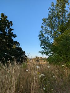 I hear footsteps approaching slowly. A doe is walking down the trail towards me. She sees me, pauses, and veers off the trail in a different direction, heading into the trees and disappearing from view. The silhouettes of trees are now distinctly separate from the dark gray of the sky. Daybreak approaches, and I see the very first headlights of a farm worker arriving for work on the far side of the vineyard. The clock is ticking. It is a new day.