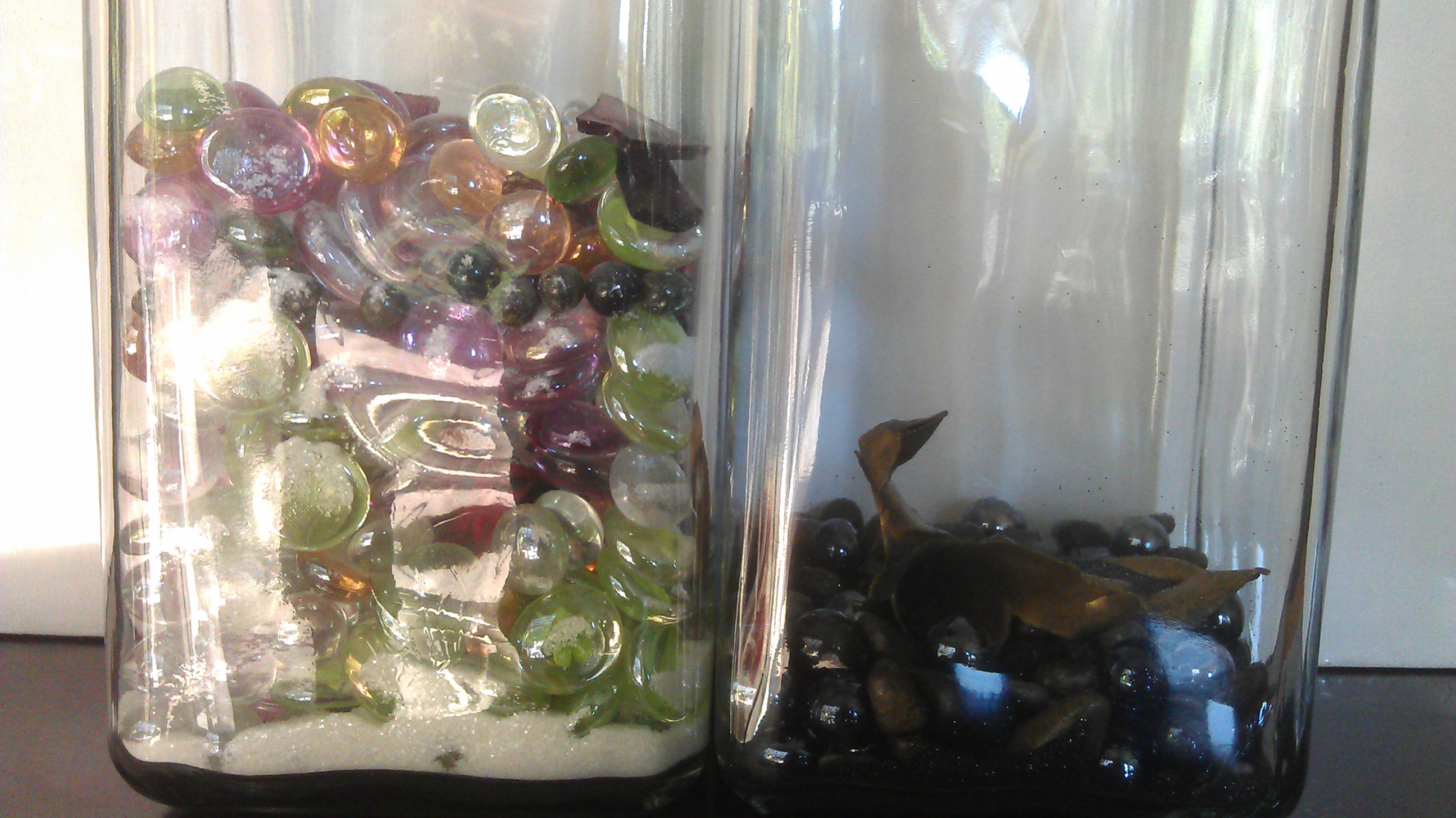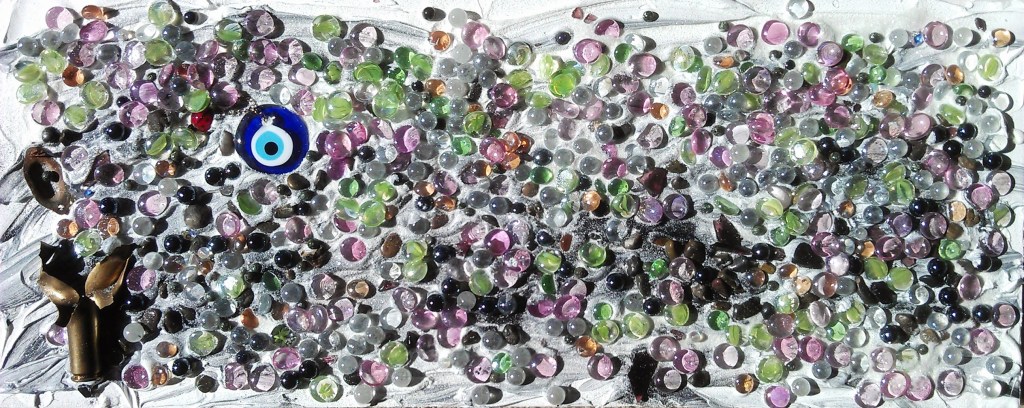 I was in a rough place emotionally when I started this blog 10 years ago. At the same time I started this blog, I started an art project on the theme of perspective and experience, and the subjective nature of memory vs lived experience. I used two large glass containers, and into one I dropped dark stones, black glass “pebbles” and mementos of sorrow or grief, and small amounts of black glitter representative of darker moods. Into the other, I dropped light colored glass “pebbles”, glow glitter, and things reminiscent of joy and day-to-day moments of pleasure. Not so much “good vs bad” as pleasant vs unpleasant. I wanted to gauge “how bad is it really?” in some visible way. I kept it going until I was ready to create “Perspective” on canvas, some 6 months later.